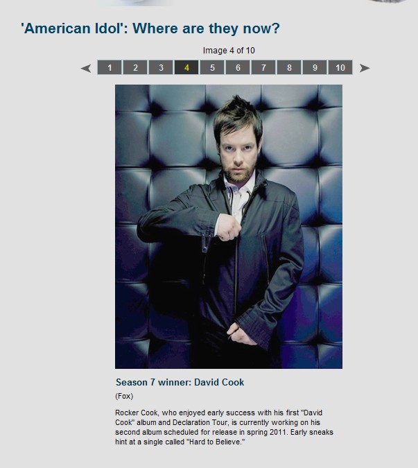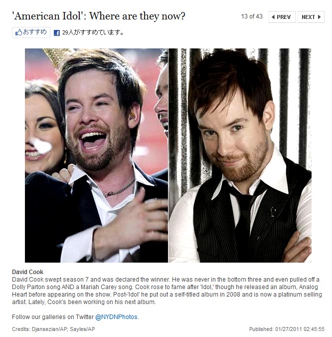 DC部分コピペ:I prefer contestants like David Cook, who ignored the “Idol” machine’s efforts to publicize his brother’s struggle with brain cancer in Season 7. He created his only “Idol” story that had nothing to do with the tragedies in his personal life and everything to do with his evolution from schlubby bar singer to sexy rock star. 兄が脳腫瘍を患っている事の苦闘をアイドルの宣伝力で公表しなかったS7のDavid Cookのような人物の方がいい。 彼は、彼だけの"アイドルストーリー" を、彼のプライベートな部分の悲劇から完全に独立した、生活も外見もうだつの上がらないバーシンガーが、セクシー・ロックスターに進化していくものとして作り上げた。