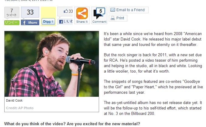 2008年のアルバムに続くアルバムの製作をスタジオでがんばってる、そんな元アメリカアイドルから映像が届いたよ、アルバムに入るだろう短い曲のクリップも含んだ白黒の映像をぜひ、オフィシャルサイトでチェックしなよ、っていう感じです。最後に、リリース日はまだ未確認ともつけたしてます。うまくまとめてくれてますよね?