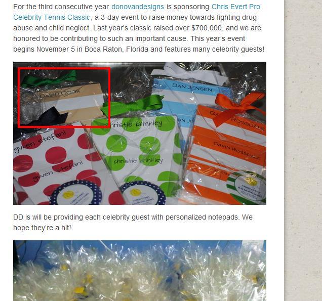 このdonovandesignsは、3年連続でスポンサーとしてこのテニスイベントを援助してるところ。今年は、招待されているゲスト用の特別ギフトパッケージ(名前の入ったノートパッド(メモ帳みたいなものかと)を用意。また、他にも1000個の小物が入った小さなパッケージもイベントで使ってもらうように寄付。