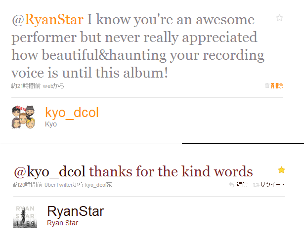 あ、ライアンと言えば・・・完全に私事で申し訳ないのですが、なんとー!ツイッター上で、お返事をもらえましたー!!!凄く嬉しかったです。