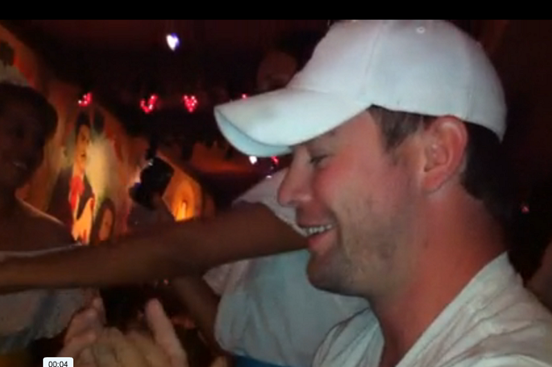 えーっと、この映像は、アンディがアップしてくれた、Montyのフェイクバースディ・・・お店の人に、「この人誕生日なんです~」っておそらくウソを伝えて、みんなでわーっ!!ってやったのかな?