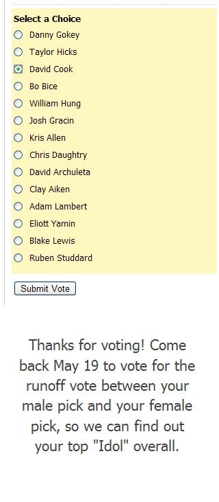 リンク先は、男性リストです。ディフォルトでなぜがダニゴキにチェックマークがあるので、David Cookを選んで、投票ボタンを押して下さいね。