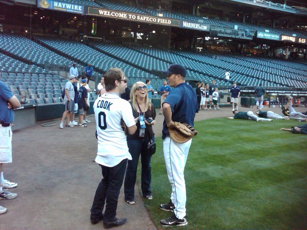 "Update Friday 8/24 6:59 p.m. : This might win the award for earliest update, but I felt you simply must know that David Cook of American Idol threw out the first pitch. Wearing a Mariners' jersey, the southpaw hammed it up, going into a stretch and peering in to catcher Mike Sweeney for imaginary signs. But his pitch was pretty solid, and he got a big hug from Sweeney afterward. Then again, who doesn't?"