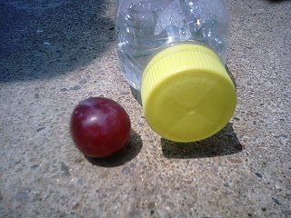 グレープの大きさをわかってもらうために撮影したのですが、これは普通のペットボトルではなく、ヴォルビックのペットボトルです。(ヴォルビックのレモンはおいしい←無関係)