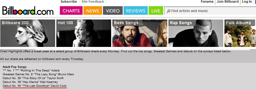 つぶやき1:DAVID COOK's "The Last Goodbye" debuts at #40 on the Adult Top 40 chart.