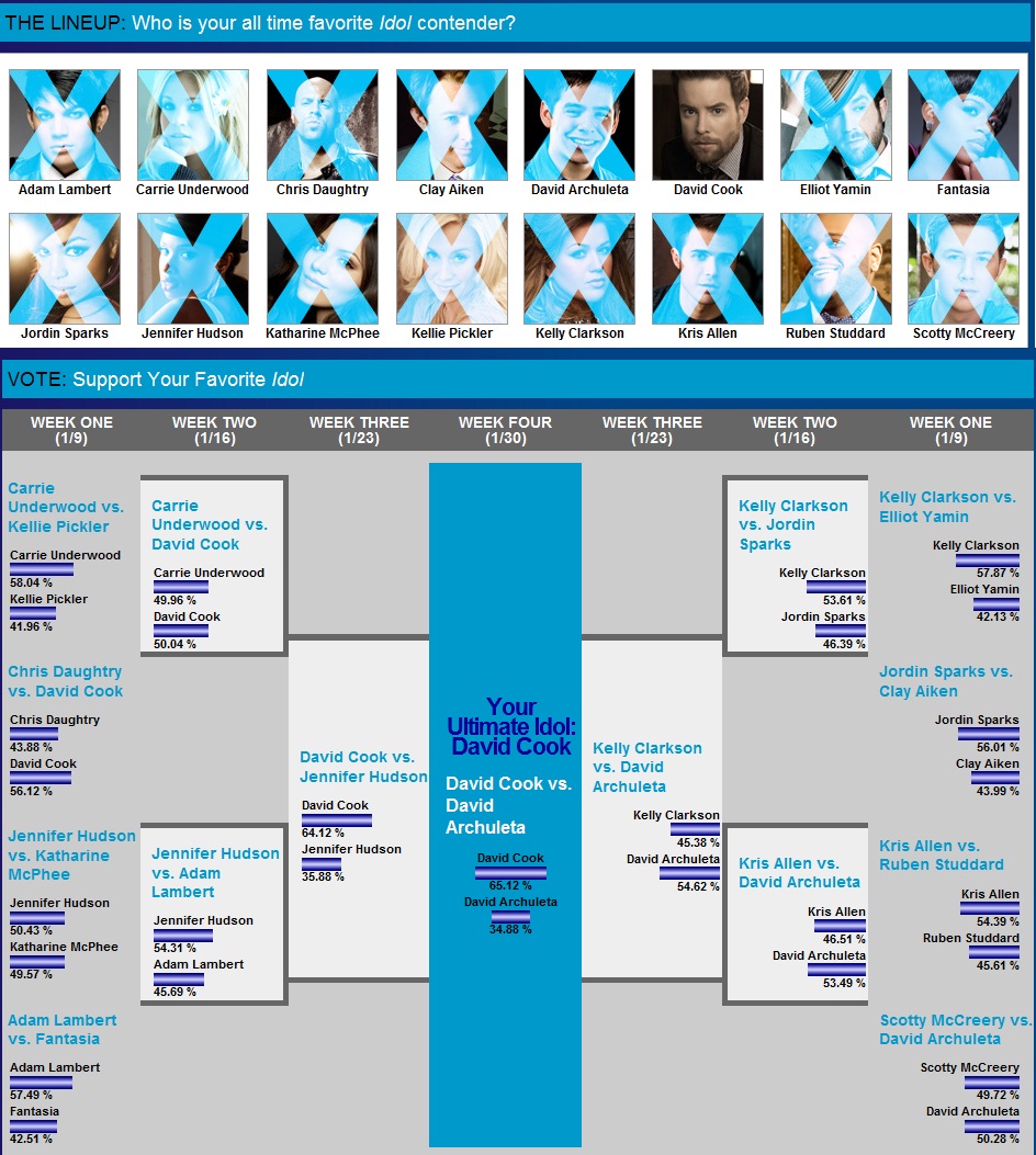 DC部分コピペ:“My favorite Idol contestant has to be David Cook,” he said in a video on American Idol’s website. “I thought he was honest with his performances and the way he sang and took the competition seriously, but he was also humble about most everything. He seems like a really nice person.”