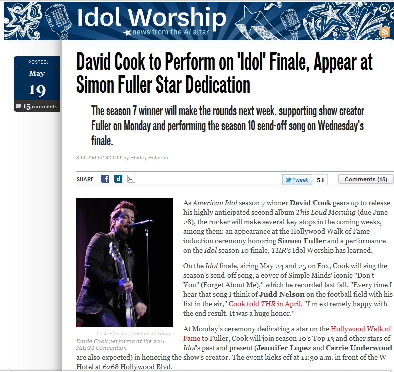 アメリカンアイドルが、ここ数シーズン、本物のヒットメーカーを輩出してない、と書いたあとにカッコで、David Cookがこの番組が最後に輩出したスターかもしれない、と言及。ありがたいこって。