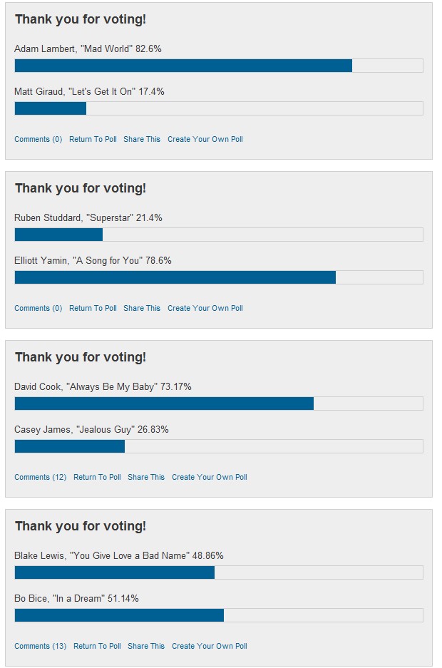 DC部分のコピペ:Sad, considering without risk-taking, we wouldn’t have Kris Allen’s “Heartless,” Adam Lambert’s “Mad World,” Blake Lewis’ “You Give Love a Bad Name,” Bo Bice’s “In A Dream,” and pretty much any performance from David Cook.