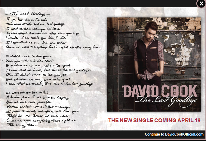 E!:私たちはDavidがセカンドアルバム・This Loud Morning用の撮影をしているところにお邪魔しました。アルバムは6月28日までリリースしませんが、彼はSimple mindsのDon't you Forget About meなどリメイクしたりして忙しくしています。この曲は今年のアメリカンアイドルのExitソングです。