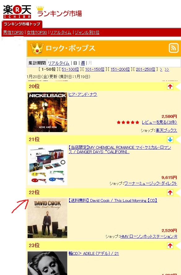 あ、ランキングっていえばね・・・これもたまたま見つけたのですが、楽天(20日)のロック・ポップのデイリーランキングで22位にあがってました。ウホッ(すでに翌日はランク外でしたが。いやん)