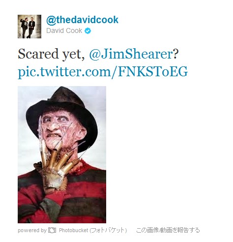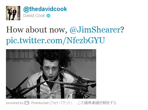 Jimさん:Tomorrow at 9AM on #VH1Buzz @thedavidcook is going down (or at least his hair is): 明日の午前9時・VH1 BuzzでDavid Cookが敗北するよ。(少なくとも彼の髪はね)
