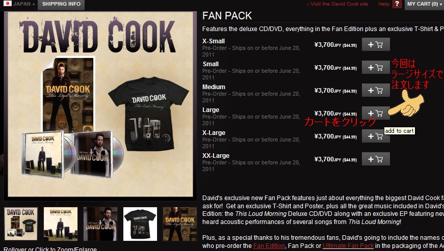 Tシャツのサイズを選んで、その横のカートをクリック