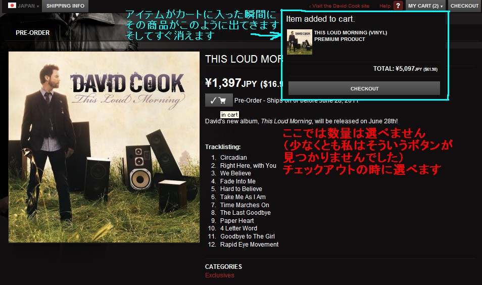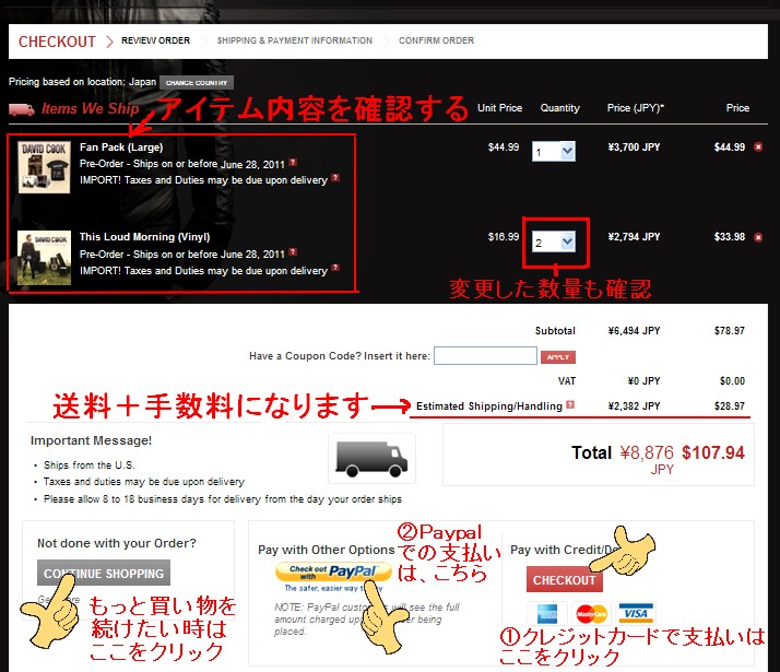 ※一括にすると送料が安くすむと思いがちですが、トータルの重さではなく、1アイテムにつき、そのアイテムの送料・・・とセットになっているようですので、あとから1アイテムつけたしたい!と思ったら、キャンセルしてもう一回始めから・・・とせず、新しいオーダーをすることをお勧めします。 (例:2枚Fan editionを頼んだ時の送料と、別々にした2オーダーでの合計金額はほぼ同じだと思います)