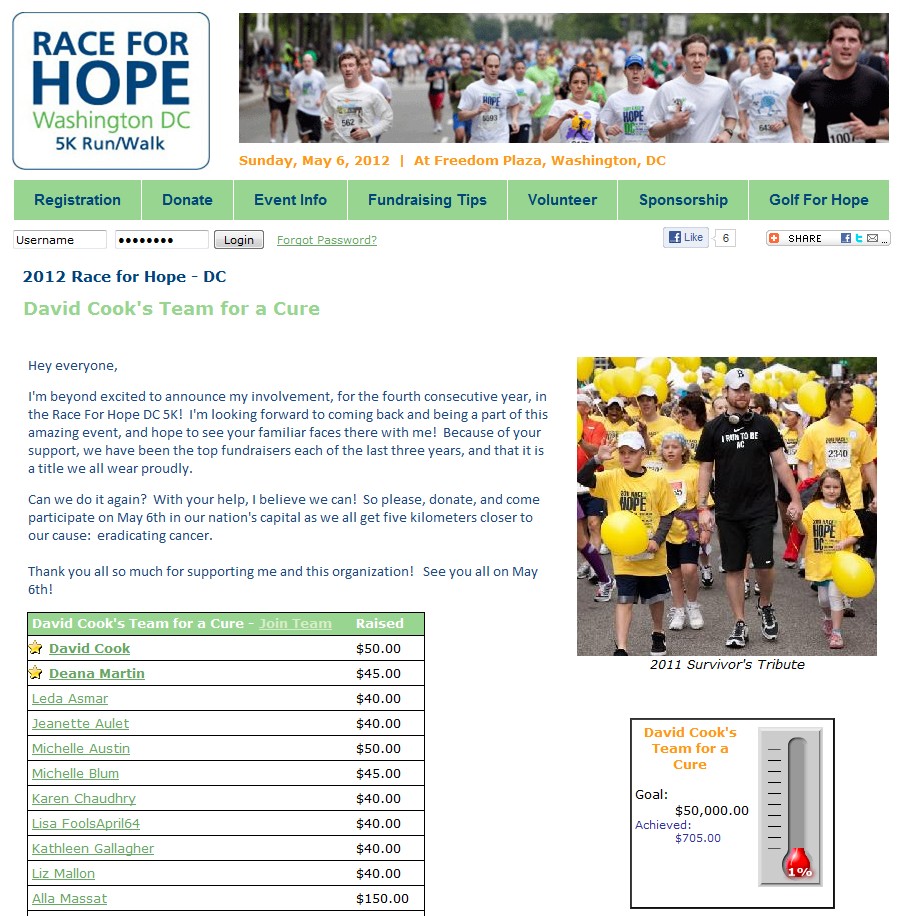4年連続でこの活動に参加出来ることをとても楽しみにしている、懐かしい顔に会えるのを楽しみにしてる、サポートしてくれてる皆のおかげで過去3年間、募った寄付金が参加チームの1位を獲得してこれた、是非今年も続けよう!っていう感じかな。寄付だけじゃなく、実際のレースへの参加もよびかけて、5月6日には、首都に集まって癌の撲滅に皆で5キロ近づこう、って。