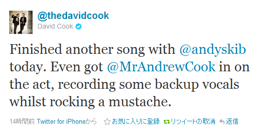 今日はアンディと作ったもう一曲が完成。アンドリューも一緒に加わって、口髭をブイブイいわせながら、バックアップボーカルをレコーディングしたんだ ・・・だって!アンドリューも!ヒューヒュー!ヽ(・∀・)ノ