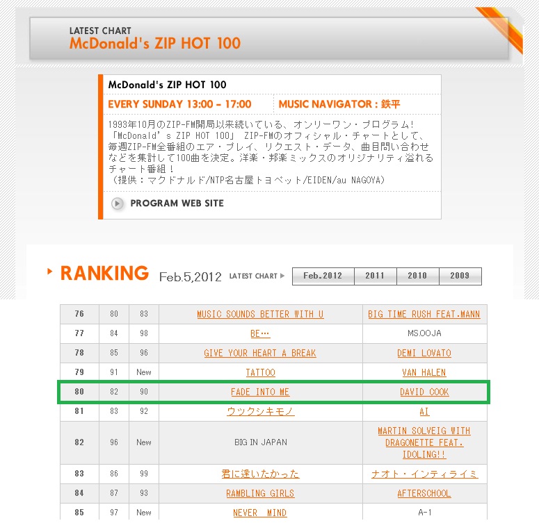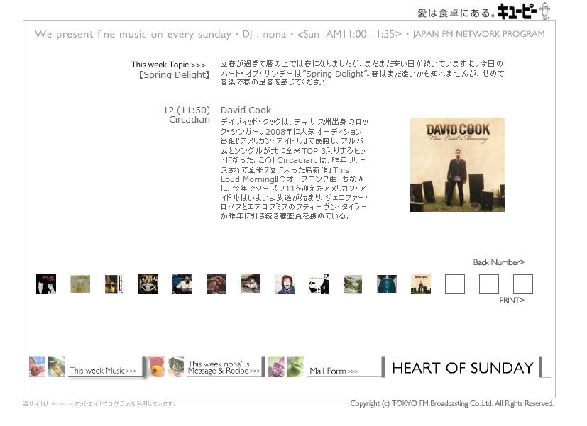 で、確認したら、"Heart Of Sunday"っていうTOKYO FM系38局ネットで放送されてる番組で流してもらったようです。なので、この番組を放送してる局が放送した曲をツイートしてるアカウントから"Circadian" David Cook関連のつぶやきが沢山出てきたみたい。