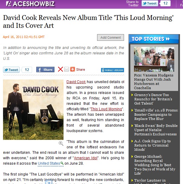 残りの部分は・・・シーズン7優勝者・David CookがセカンドアルバムとなるThis Loud Morning (19 Recordings/RCA Records)を6月28日にリリース。 This Loud MorningはDavidcookoffical.comで、4月19日より先行予約が可能となr。